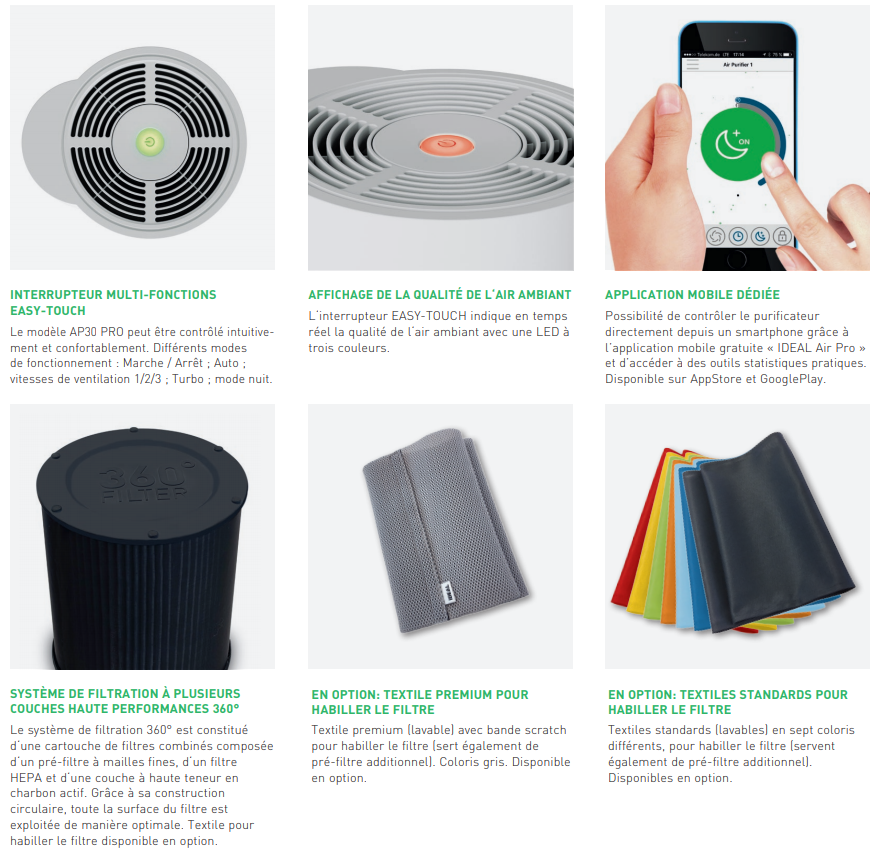 Système de filtrage à 360° innovant avec un filtre HEPA longue durée et une part de charbon actif extrêmement élevée. Panneau de commande très simple d’utilisationLe modèle AP60 peut être contrôlé intuitivement et confortablement. Différents modes de fonctionnement : Marche / Arrêt ; Auto / Manuel / Turbo ; minuterie, mode nuit.Indicateur de la qualité de l‘aIrLa qualité de l‘air ambiant est indiqué en temps réel par un affichage LED indirect à 3 couleurs. Équipé d’un capteur de particules fines et d’un capteur olfactif de COV – pour un air intérieur parfait en mode Auto.Capteurs intelligents de la qualité de l‘air ambiantÉquipé d’un capteur de particules fines et d’un capteur olfactif de COV – pour un air intérieur parfait en mode Auto.La puissance compacte.Comparé aux solutions AC, le moteur EC GreenTech assure jusqu‘à 50 % d‘économie d‘énergie, tout en étant extrêmement silencieux. Grâce à lui, l‘AP60 Pro est l‘un des nettoyeurs d‘air les plus silencieux et les plus performants du marché – Made in Germany.Télécommande pratique.L‘AP Pro peut également être commandé en tout confort avec la télécommande. Elle est magnétique – pour être rangée sur le boîtier métallique.Système de filtration à plusieurs couches haute performances 360°Le système de filtration 360° est constitué d‘une cartouche de filtres combinés composée d‘un pré-filtre à mailles fines, d‘un filtre HEPA et d‘une couche à haute teneur en charbon actif.Application mobile « IDEAL AIR PRO »Pour un contrôle étendu et une interrogation de l’appareil. L’application « IDEAL AIR PRO » est disponible gratuitement sur AppStore et GooglePlay